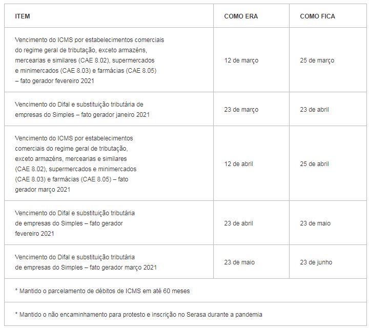 Permanecerão também em vigor as possibilidades de parcelamento de débitos do ICMS em até 60 meses, bem como seguirão sem encaminhamento para protesto e inscrição no Serasa os casos de inadimplências ocorridas durante a pandemia.