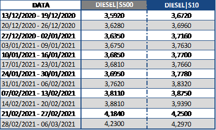 No quadro abaixo se encontram a variação do diesel a nível Brasil da Agência Nacional de Petróleo, Gás Natural e Biocombustíveis (ANP) para diversos períodos e o respectivo impacto no serviço de transporte.