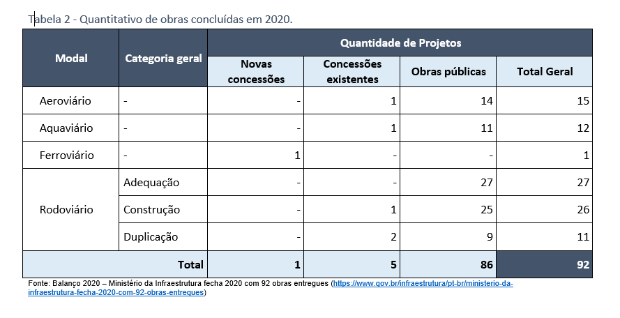 Em 2019, a maior parte dos projetos entregues pelo governo federal, era do modal aeroviário (17). No ano seguinte, os projetos rodoviários constituíram maioria (61) e contemplaram tanto construção como adequação da infraestrutura viária existente.