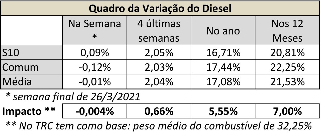 No quadro abaixo se encontram a variação do diesel a nível Brasil da ANP para diversos períodos e o respectivo impacto no serviço de transporte.