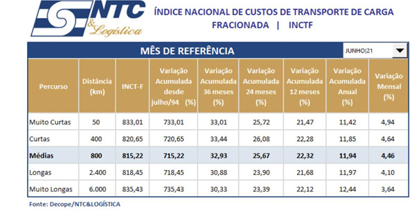 DA NTC&LOGÍSTICA comunica aos associados que a variação média do (INCTF DECOPE/NTC) acumula nos últimos doze meses 22,32% (vinte e dois vírgula trinta e dois por cento), entre julho de 2020 e junho de 2021 (junho de 2021*/- sobre junho de 2020 ou ainda, nos últimos doze meses).