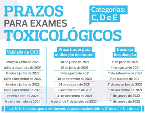 Os profissionais que renovaram a CNH entre março e junho deste ano devem ter realizado o exame até 30 de junho e a fiscalização já foi iniciada. O descumprimento da norma é considerado infração gravíssima de acordo com o Artigo 165-B do Código de Trânsito Brasileiro (CTB) e pode resultar em multa de R$1.467,35.