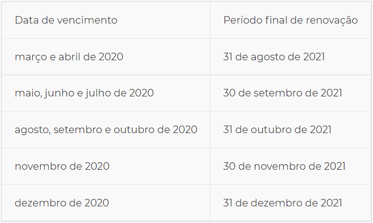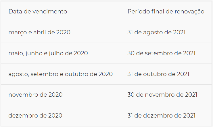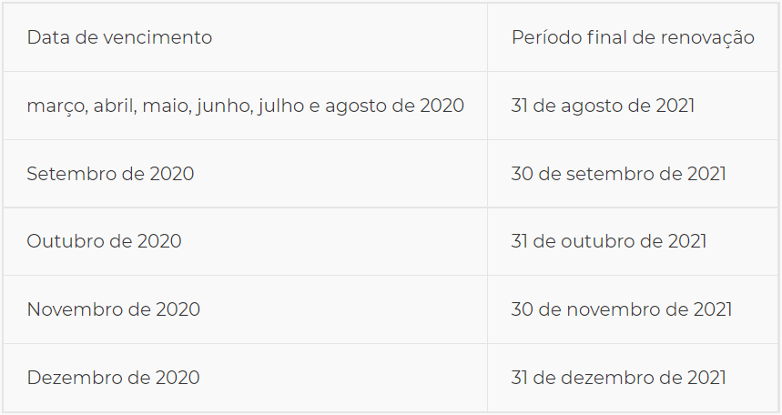 Para fins de fiscalização, consideram-se válidas as CNH, PPD e ACC vencidas desde 1º de março de 2020 e com vencimento até 31 de dezembro de 2021, até a nova data correspondente para renovação definida no cronograma.