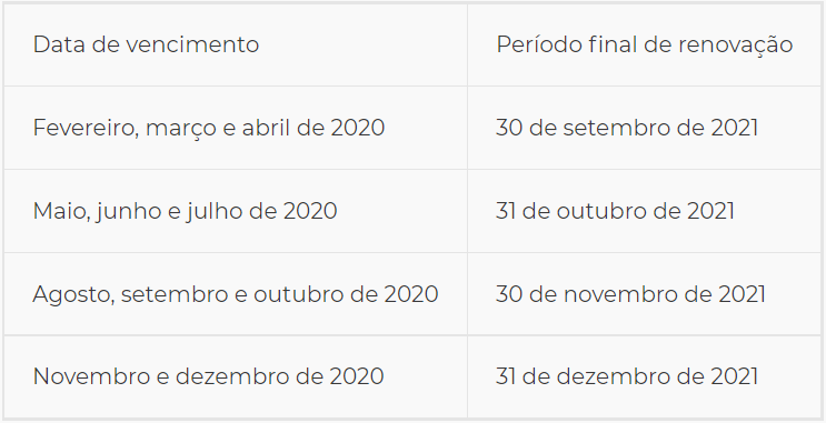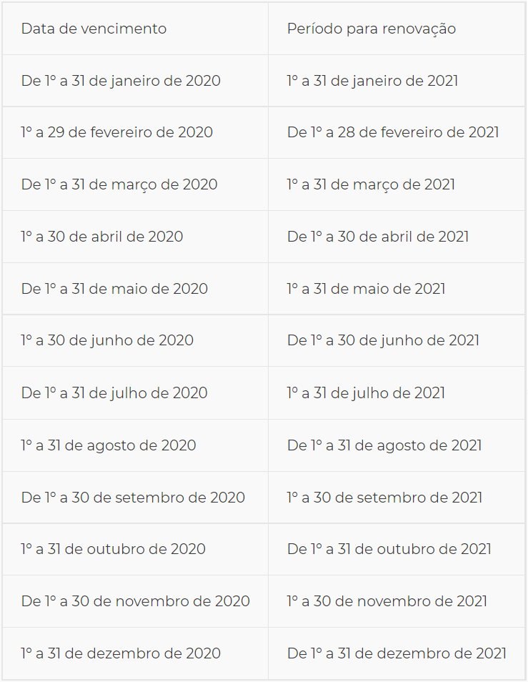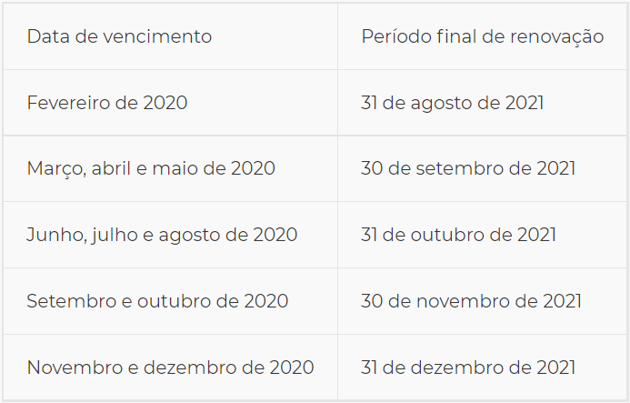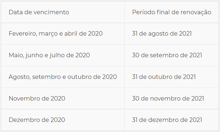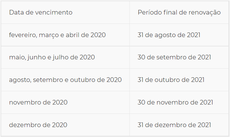 Para fins de fiscalização, consideram-se válidas as CNH, PPD e ACC vencidas desde 1º de fevereiro de 2020 e com vencimento até 31 de dezembro de 2021, até a nova data correspondente para renovação definida no cronograma.