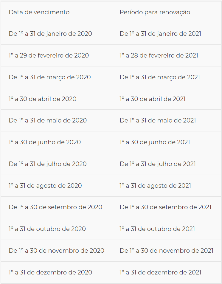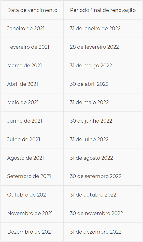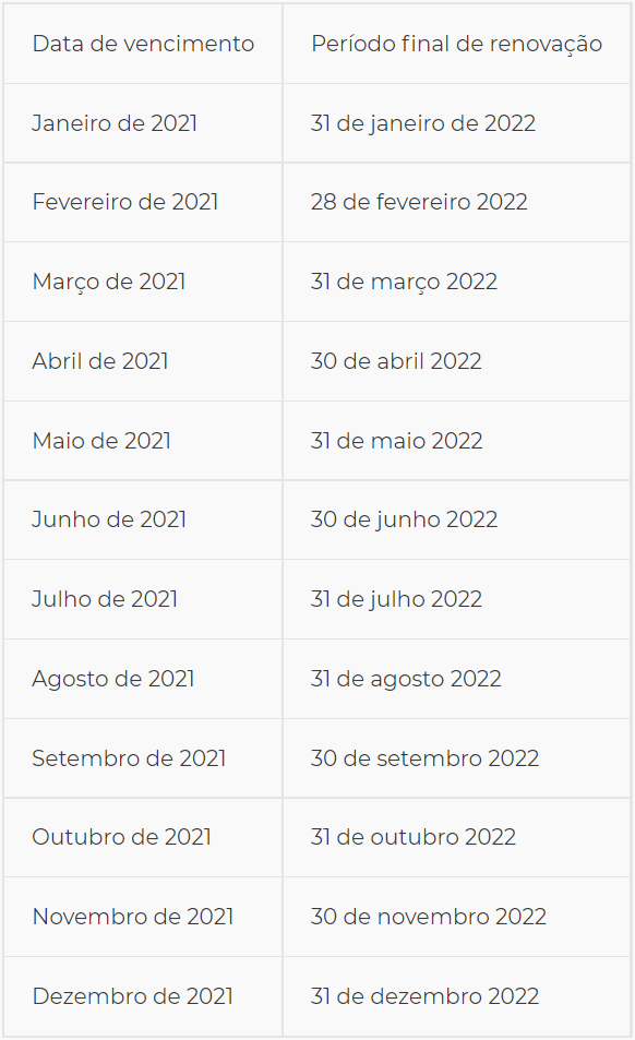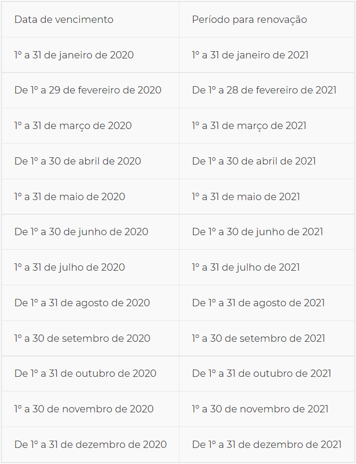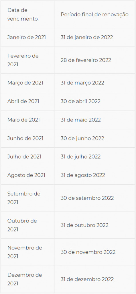 Em outras palavras, para fins de fiscalização, consideram-se válidas as CNH e ACC vencidas desde 1º de fevereiro de 2020 e com vencimento até 31 de dezembro de 2021, até a nova data correspondente para renovação definida no cronograma.