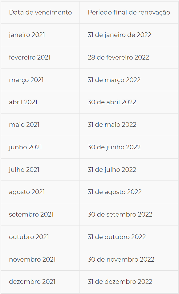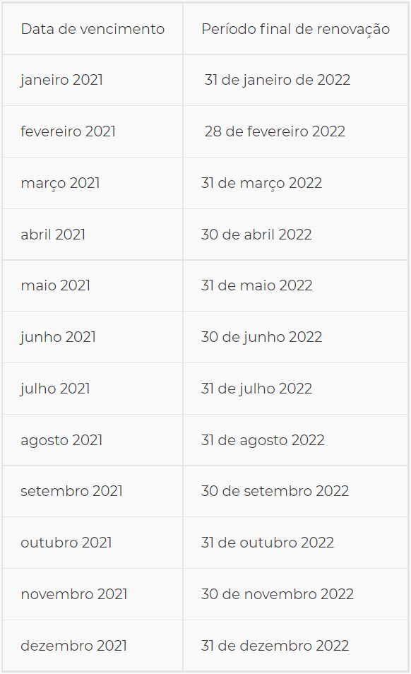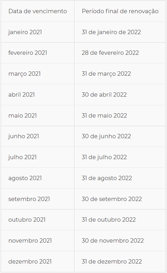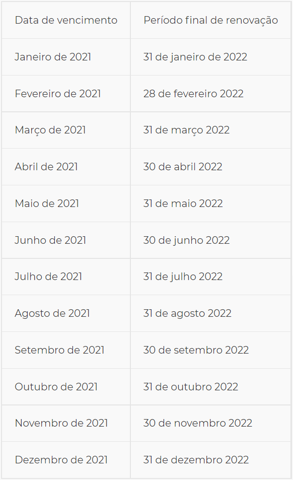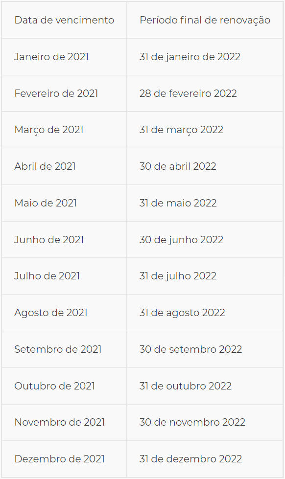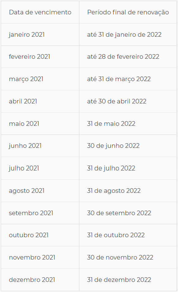 Em outras palavras, para fins de fiscalização, consideram-se válidas as CNH e ACC vencidas desde 1º de fevereiro de 2020 e com vencimento até 31 de dezembro de 2021, até a nova data correspondente para renovação definida no cronograma.