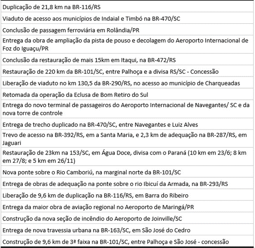 A restauração da BR-101/SC, entre Palhoça (SC) e a divisa entre Rio Grande do Sul e Santa Catarina, garantiu pista duplicada e marginais, 203 obras de artes especiais recuperadas, entre pontes, viadutos e passagens inferiores; 20 passarelas revitalizadas; 3 mil novas placas de sinalização implantadas; novas cercas construídas e recuperação da iluminação da Ponte Anita Garibaldi, em Laguna (SC).