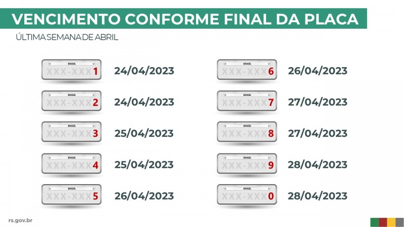 Quem não optar pela antecipação ou pelo parcelamento, deverá pagar o IPVA na data de vencimento da placa que se encerra em abril, conforme determinado na lei estadual. O vencimento em 2023 segue a seguinte ordem: