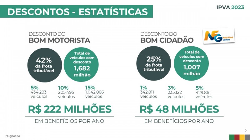 Também em três faixas, a redução no valor do IPVA pelo Bom Cidadão resulta da participação do contribuinte (pessoa física) no programa da Nota Fiscal Gaúcha (NFG) e a solicitação de notas com CPF na hora da compra.