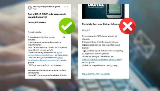 O DetranRS alerta para mais um golpe virtual, dessa vez envolvendo o documento do licenciamento 2023. Uma mensagem falsa é enviada por e-mail, bem parecida com a que a Autarquia envia, porém com um link onde seria possível baixar um arquivo em PDF. Importante ficar atento e não clicar no link, pois o DetranRS não envia o certificado de licenciamento por e-mail, ele só pode ser gerado pelo proprietário do veículo, dentro dos canais oficiais de atendimento. O link na verdade é um phishing, tipo de fraude em que dados pessoais são coletados para serem usados posteriormente em crimes virtuais. Para se proteger, importante sempre desconfiar de links que cheguem por e-mail, SMS ou WhatsApp. Mensagens e avisos do DetranRS podem ser consultados na Central de Serviços, ou são disparados por e-mail exclusivamente do endereço nao-responda@detran.rs.gov.br (uma forma de deixar claro que a ferramenta só tem saída, não aceita respostas). Outra forma de se proteger é sempre desconsiderar mensagens que fazem referência genérica a “Detran” e não trazem a informação da UF, como sac@detran.gov.br ou licenciamento@detran.gov.br, que são falsos, pois sequer têm o RS. Mas ainda que o remetente se pareça de uma fonte oficial, pode ser uma falsificação. O que é falsificação de domínio? Falsificação de domínio ocorre quando os cibercriminosos falsificam o nome de um site ou domínio de e-mail para tentar enganar os usuários. O objetivo da falsificação de domínio é induzir um usuário a interagir com um e-mail malicioso ou um site de phishing como se fosse legítimo. A falsificação de domínio é como um vigarista que mostra a alguém credenciais falsas para ganhar sua confiança antes de tirar vantagem delas. Fonte: https://www.cloudflare.com/pt-br/learning/ssl/what-is-domain-spoofing/ CRLV digital O certificado de licenciamento (CRLV) agora é digital, o documento verde em papel-moeda não é mais emitido em todo o país desde agosto de 2020. Após a total quitação do licenciamento (IPVA, multas vencidas caso existentes e taxa de licenciamento), o documento do veículo é atualizado no sistema do DetranRS, mas é o proprietário que deve buscar os canais oficiais para acessá-lo. Portanto, nunca será enviado um arquivo do documento por e-mail. Como acessar O CRLV pode ser gerado pelo proprietário no celular, por meio do aplicativo Carteira Digital de Trânsito, e esse formato já é suficiente para circular em todo o país. Caso queira, o proprietário tem ainda a opção de imprimir uma via em papel A4 em qualquer impressora, que terá um código de verificação (QR-code) aceito não só no Brasil, mas também nos países do Mercosul. Essa impressão pode ser feita a partir da Central de Serviços do DetranRS, ou do Portal da Secretaria Nacional de Trânsito (Senatran). Veja o passo a passo de como gerar o seu CRLV digital, ou imprimir o documento no site www.detran.rs.gov.br, menu “veículos”, seção “licenciamento”. Mesmo que o porte do documento seja obrigatório, ele fica dispensado sempre que os órgãos fiscalizadores puderem consultar a regularidade do veículo no sistema. Fonte: Detran.rs.gov.br
