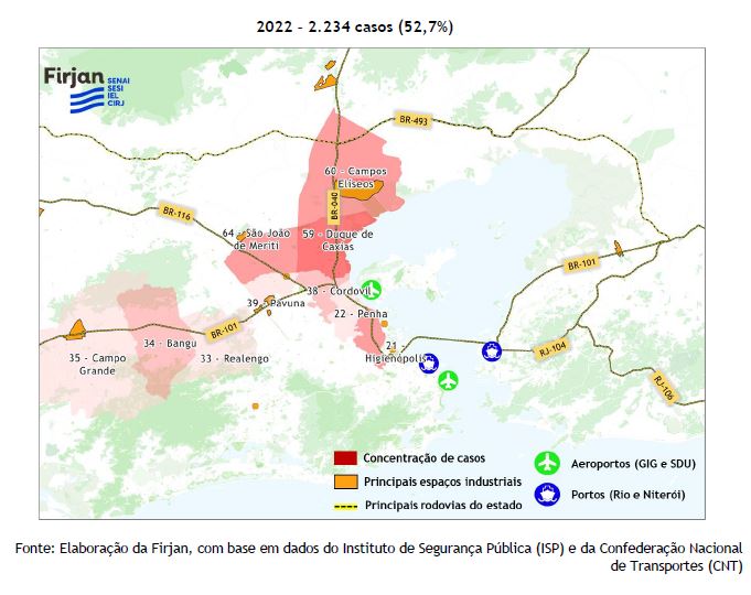 Em contrapartida, a CISP 59 – Duque de Caxias, localizada no entroncamento da BR-040 com o Arco Metropolitano e a Dutra, apresentou um aumento de 43% no indicador de roubo de carga, com cerca de 1 ocorrência por dia em 2022, figurando como a CISP que mais concentra ocorrências no Rio de Janeiro (8,7%). Além de sua importância logística, esta é uma região com grande presença industrial como, por exemplo, o Distrito Industrial de Xerém e o Polo Petroquímico de Campos Elíseos.