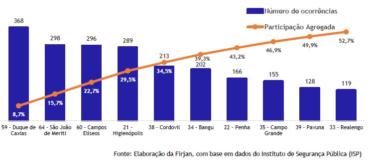 Destaque positivo para as CISP 74 – Monjolos, CISP 73 – Neves, CISP 72 – São Gonçalo, CISP 75 – Ipiiba e Sete Pontes e CISP 54 – Belford Roxo com redução dos casos de respectivamente 89%, 85%, 81%, 71% e 24%; deixando de integrar o mapa de concentração.
