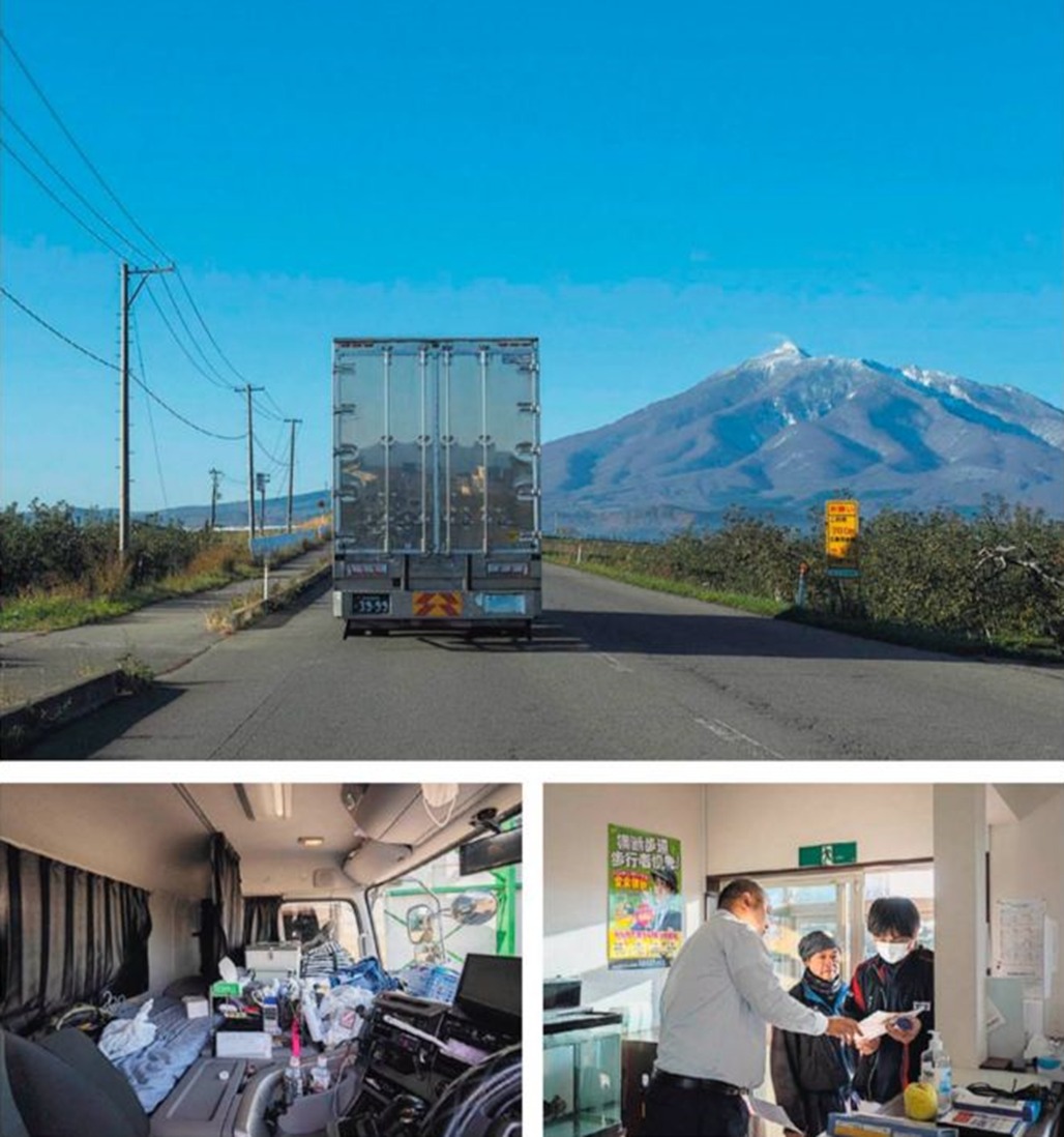 Da esquerda para a direita, Funamizu dirige em Aomori para carregar maçãs; Funamizu, à direita, e um colega de trabalho conferem a rota do dia com o chefe, Koji Kawaguchi, à esquerda; cabine do caminhão de Funamizu, que conta com um espaço para dormir e está cheia de seus pertences.