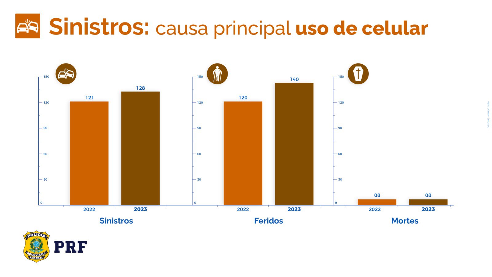 O uso de telefone celular foi a principal causa de 128 sinistros, em 2023. Em relação ao ano anterior, houve aumento de 6% na estatística. Em 2022, foram registrados 121 sinistros provocados pelo uso do aparelho ao volante, nas rodovias federais.