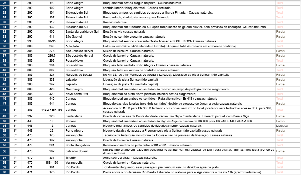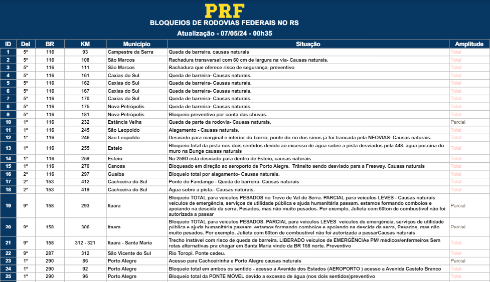 O Sistema Fetransul continua monitorando e divulgando as atualizações das rodovias federais e estaduais interditadas no Rio Grande do Sul, conforme imagem abaixo.