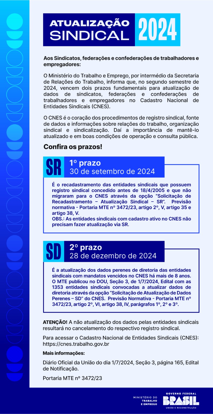 O Ministério do Trabalho e Emprego, por intermédio da Secretaria de Relações do Trabalho, informa que, no segundo semestre de 2024, vencem dois prazos fundamentais para atualização de dados de sindicatos, federações e confederações de trabalhadores e empregadores no Cadastro Nacional de Entidades Sindicais (CNES).