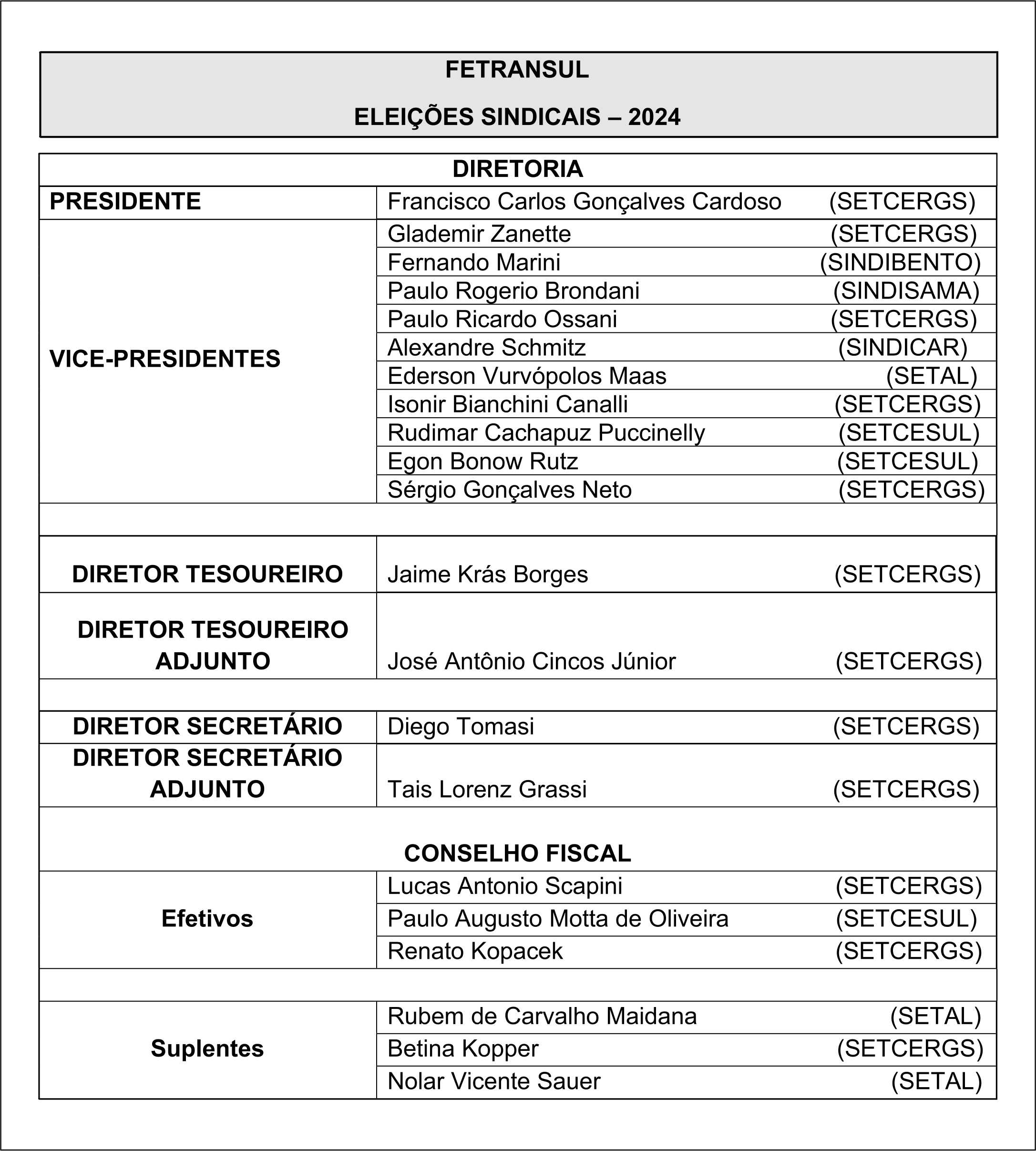 Veja abaixo a nominata da Diretoria.