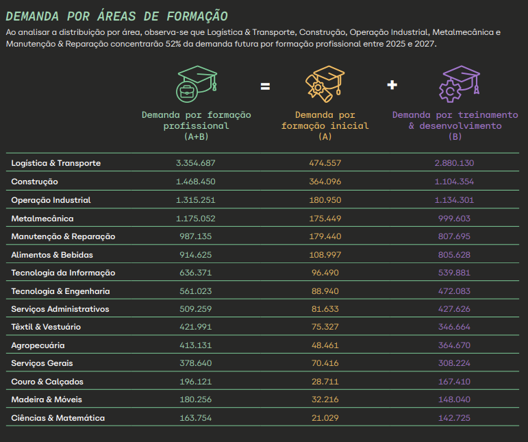 Como exposto acima, Logística e Transporte é a área que mais demandará formação, com necessidade de 3,3 milhões de profissionais qualificados, com oportunidades para motoristas de veículos de cargas, técnicos de controle da produção, almoxarifes e armazenistas, entre outros.