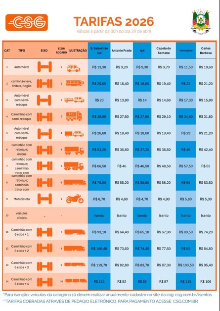 Com a aprovação da Agergs, os novos valores da tarifa para o pedágio eletrônico da CSG entram em vigor na madrugada da próxima quarta-feira, dia 29 de abril nos seis pórticos localizados na Serra Gaúcha e no Vale do Caí. A concessionária ressalta que “a definição das tarifas cumpre todas as regras do contrato de concessão e passa pela fiscalização e homologação da Agergs”. Para a categoria 1, que compreende automóveis, caminhonetes e furgões, os ajustes variam entre R$ 0,10 e R$ 0,30, a depender do pórtico free flow.